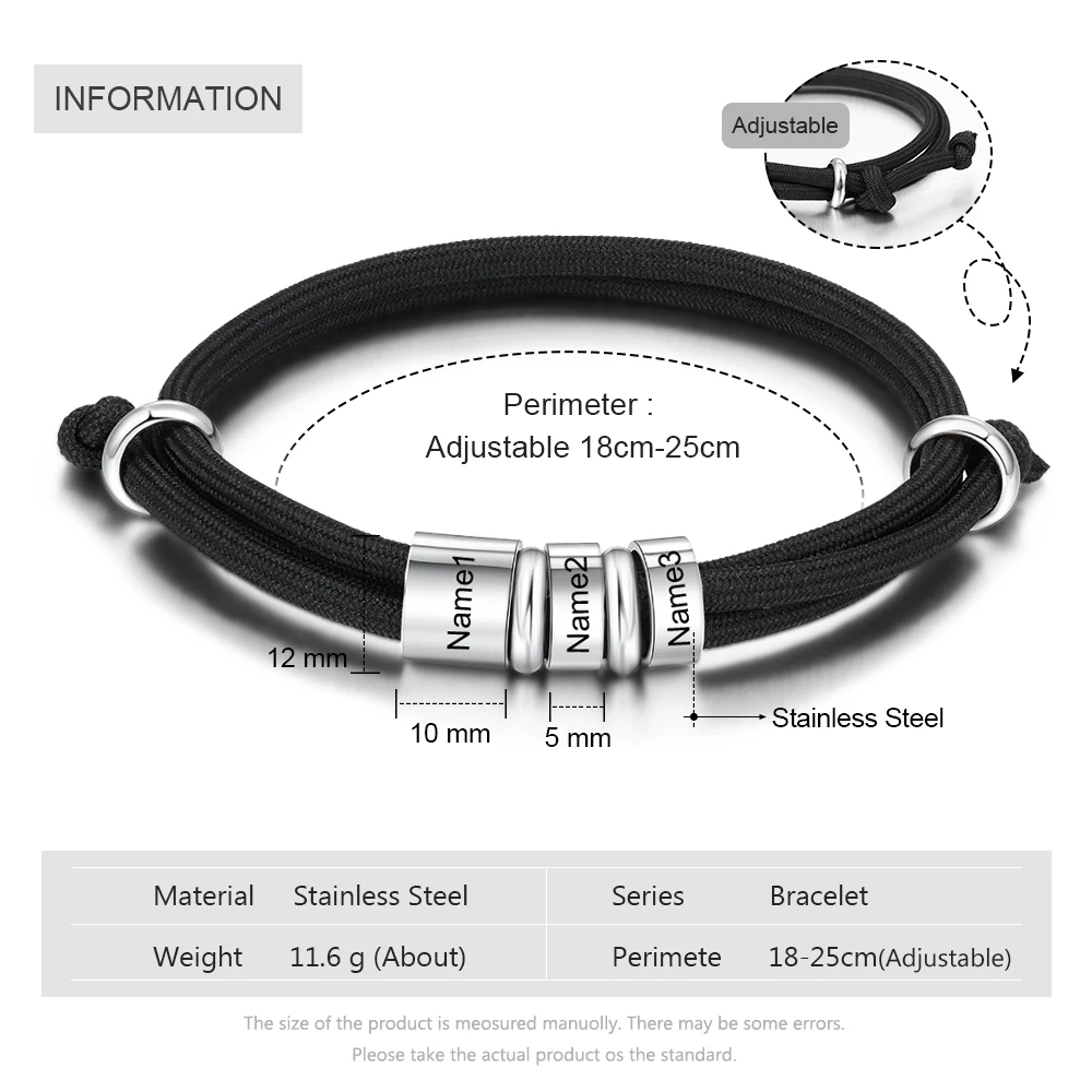 Addition Information of Personalized Stainless Steel Charm Bracelets with 3 Custom Name Beads Adjustable Rope Men Bracelets Gift for Father/Grandfather
