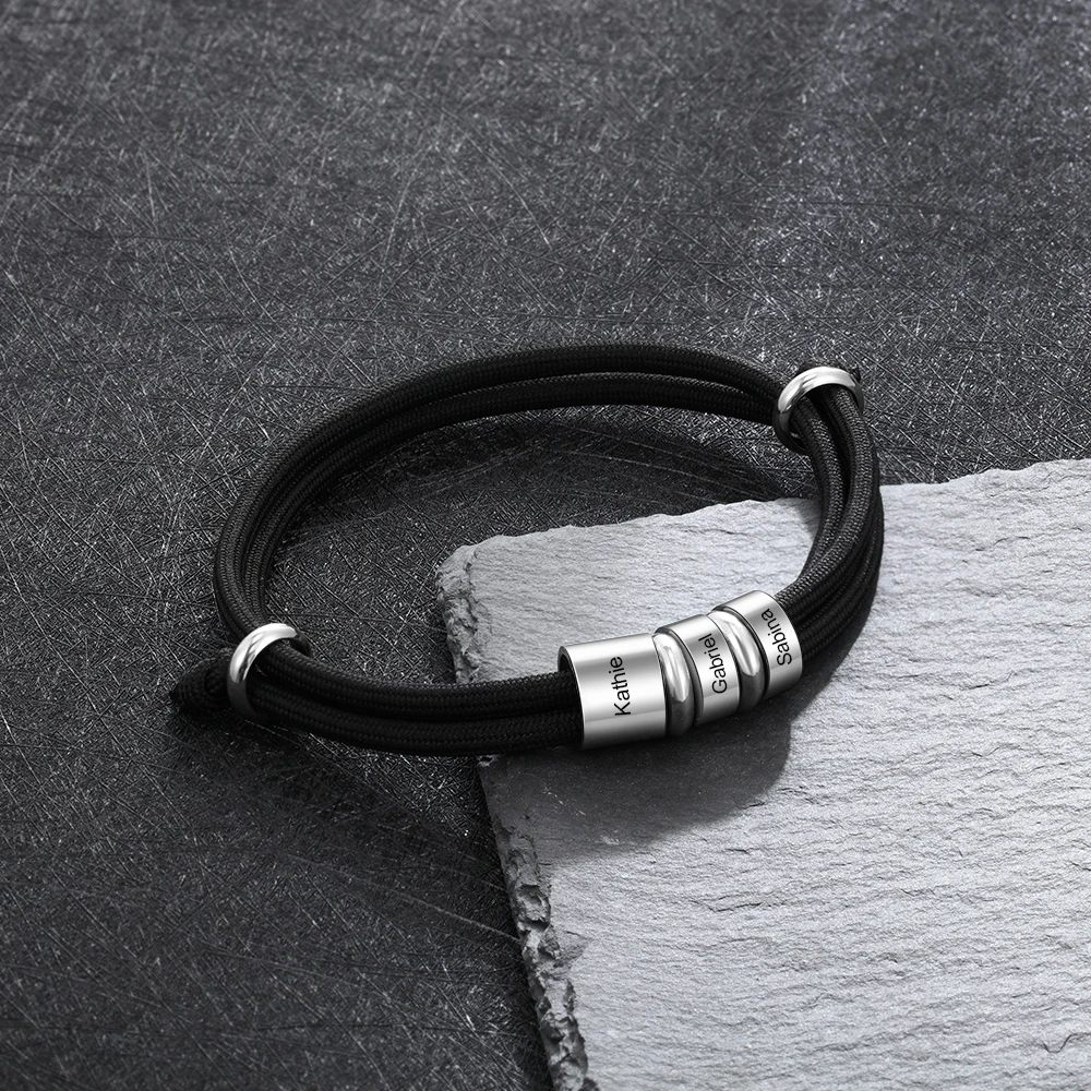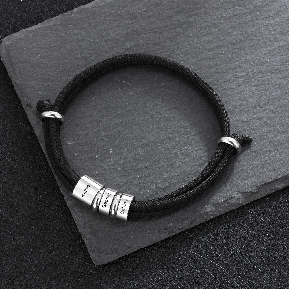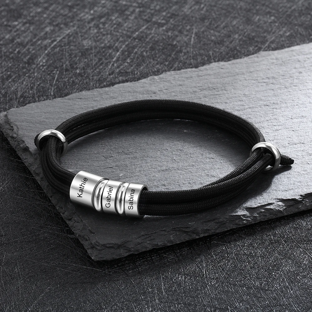 Good Price for Personalized Stainless Steel Charm Bracelets with 3 Custom Name Beads Adjustable Rope Men Bracelets Gift for Father/Grandfather