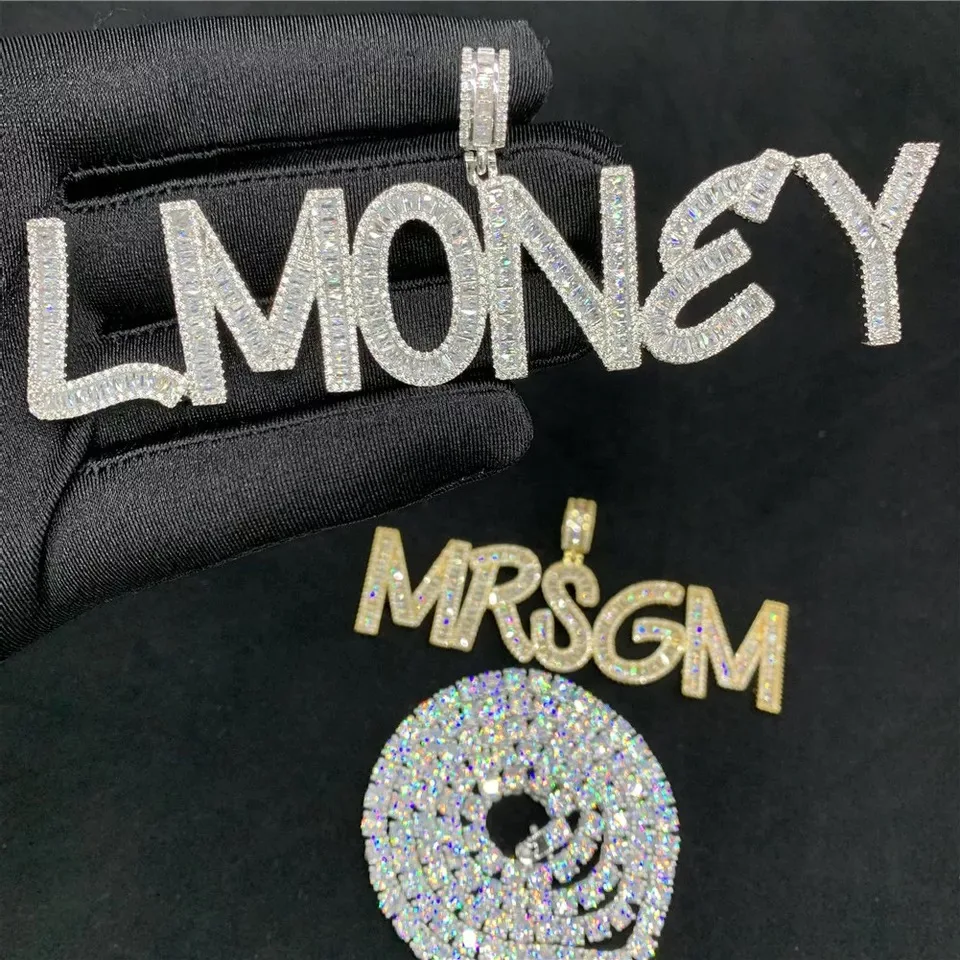 Custom Name Baguette Letters Hip Hop Iced Out Pendant with tennis chain Gold Silver Bling Zirconia Men's Hip Hop Charm Gift