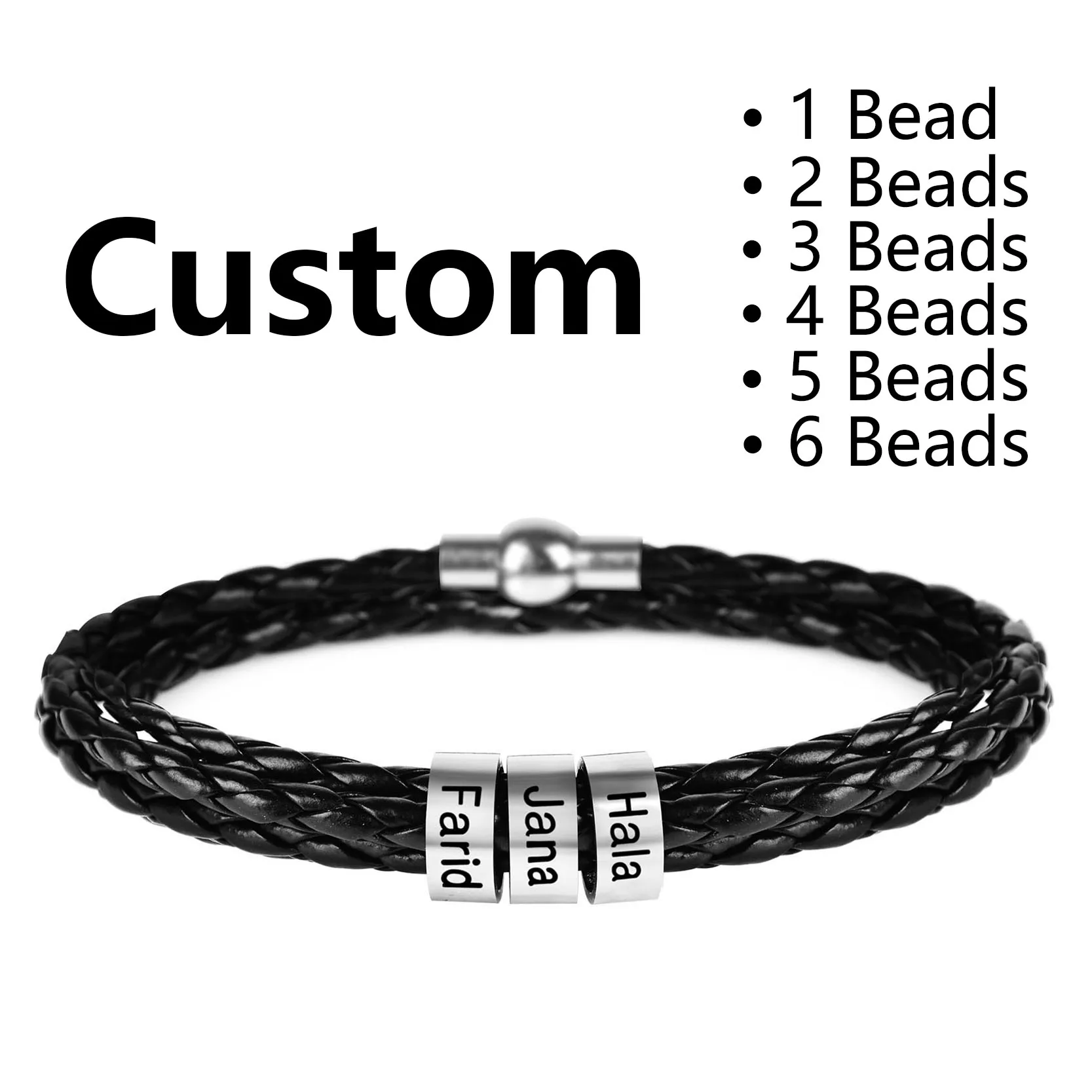 Addition Information of Personalized Mens Braided Genuine Leather Bracelet Stainless Steel Custom Beads Name Charm Bracelet for Men with Family Names