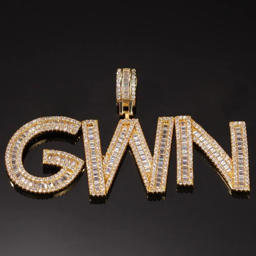 .Gallery for Custom Name Cubic Zircon Baguette Letters Hip Hop Pendant Chain Gold Silver Men's Jewelry with Tennis Chain for Gift
